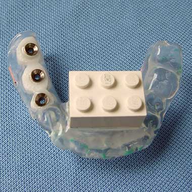 Implantate und deren Versorgung gehören heute zum Leistungsangebot eines modernen Dentallabors. AB-Dent arbeitet eng mit implantologisch tätigen Zahnärzten zusammen und verfügt über umfangreiche Erfahrungen im Bereich der Suprakonstruktionen (Kronen und Brücken auf Implantaten). Mit dem innovativen med 3D-System sind wir in der Lage, der Chirurgie ein hoch modernes Diagnostik- und Planungssystem anbieten zu können. Auf Grundlage einer Schichtröntgenaufnahme, bei der der Patient eine Bissschiene mit besonderen Markierungen trägt, werden vor der Implantation im Dentallabor mit dem Positionierer und einer speziellen Software die optimalen Positionen der Implantate auf die Bohrschablone übertragen. Der Implantologe kann dann während des Eingriffs die Bohrung sehr exakt im richtigen Winkel und in der richtigen Tiefe gewebeschonend und absolut sicher durchführen.